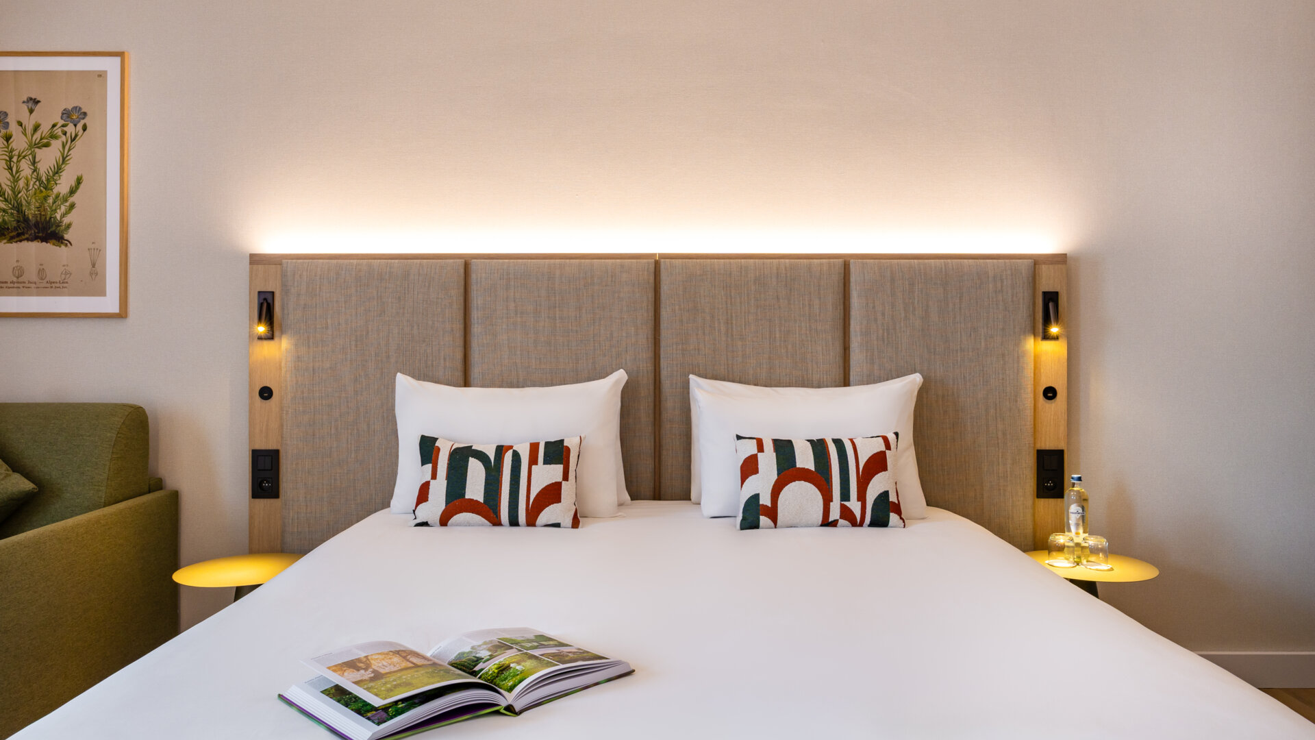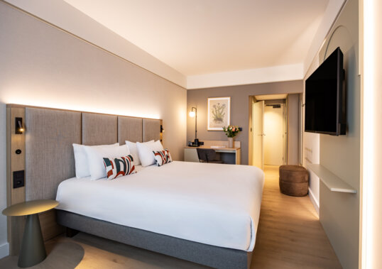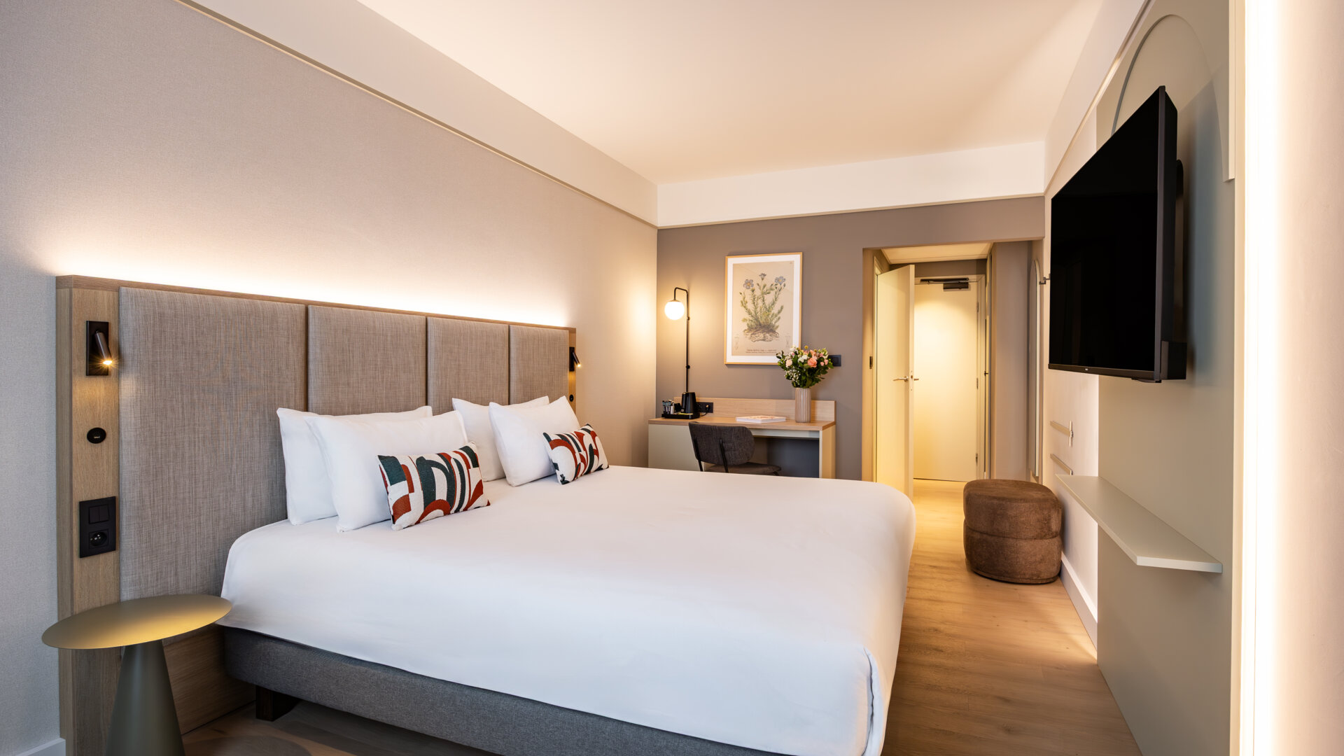 Each room features a fully equipped private bathroom, air conditioning, and all the modern amenities: flat-screen TV, free high-speed Wi-Fi, a large desk with the latest technology, and a courtesy tray with tea, coffee, and complimentary bottled water.
